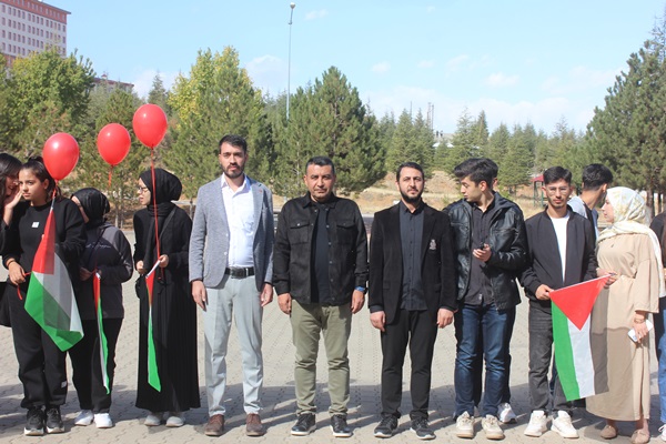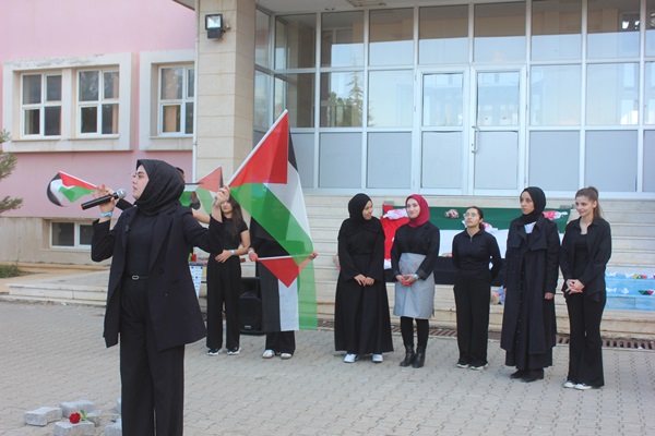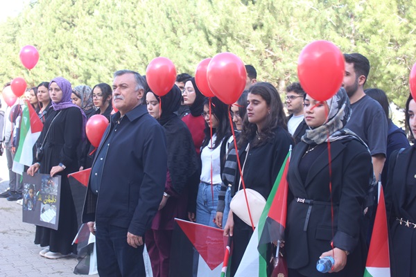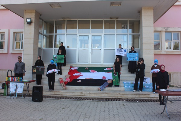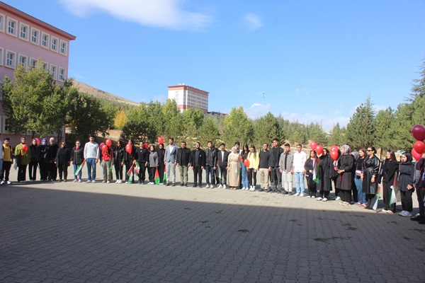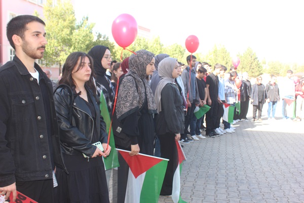 Etkinlikte öğrenciler, mazlum coğrafyalarda yaşanan acılara dikkat çekmek amacıyla sembolik bir tiyatro gösterisi sergiledi. Program, barışı ve umudu simgeleyen balonların gökyüzüne bırakılmasıyla sona erdi.