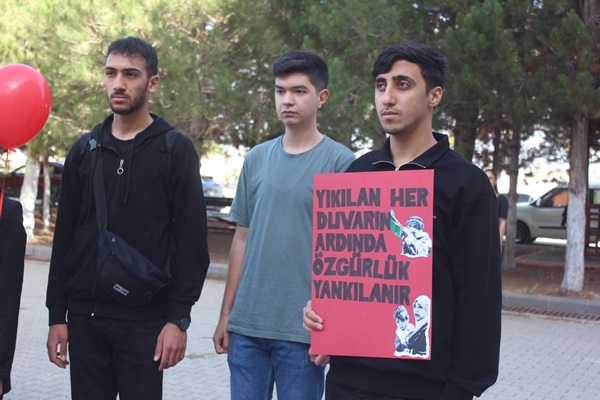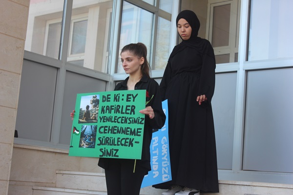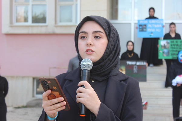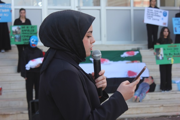Afşin Sağlık Yüksekokulu önünde düzenlenen etkinlik, saygı duruşu ve İstiklal Marşı’nın okunmasıyla başladı. Ardından öğrenciler, zulme karşı sessiz kalmama çağrısında bulundukları bir basın açıklaması yaptı.