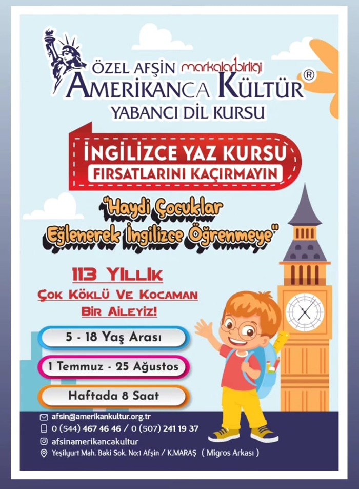 6 Şubat 2023 tarihinde yaşanan Asrın Felaketi Depremlerin hemen ardından hızla toparlanarak 2 yıl içerisinde tekrar eğitime başlayan Özel Afşin Amerikanca Kültür Yabancı Dil Kursunda İngilizce Yaz Kursu heyecanı yaşanıyor. 5-18 Yaş arası çocuklarımız için Hafta da 8 saat olmak üzere 1 Temmuz-25 Ağustos tarihleri arasında gerçekleşecek.