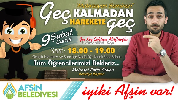 Afşin Belediyesi tarafından, Yükseköğretim Kurumları Sınavına (YKS) hazırlanan üniversite adayı öğrenciler için düzenlenecek motivasyon seminerine katılacak Gri Koç Gökhan Müftüoğlu, bir kez daha Afşinli öğrencileri seminere davet etti.