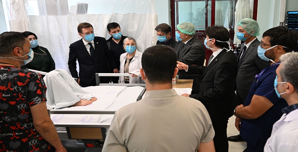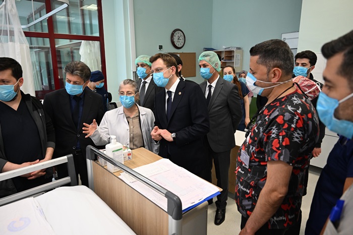 Kahramanmaraş Sütçü İmam Üniversitesi Rektörü Prof. Dr. İbrahim Taner Okumuş ve hastane yönetimi eşliğinde tedavi altındaki öğrencilerle bir araya gelen Yerebakan, yaralıların sağlık durumuna ilişkin yetkililerden bilgi aldı.