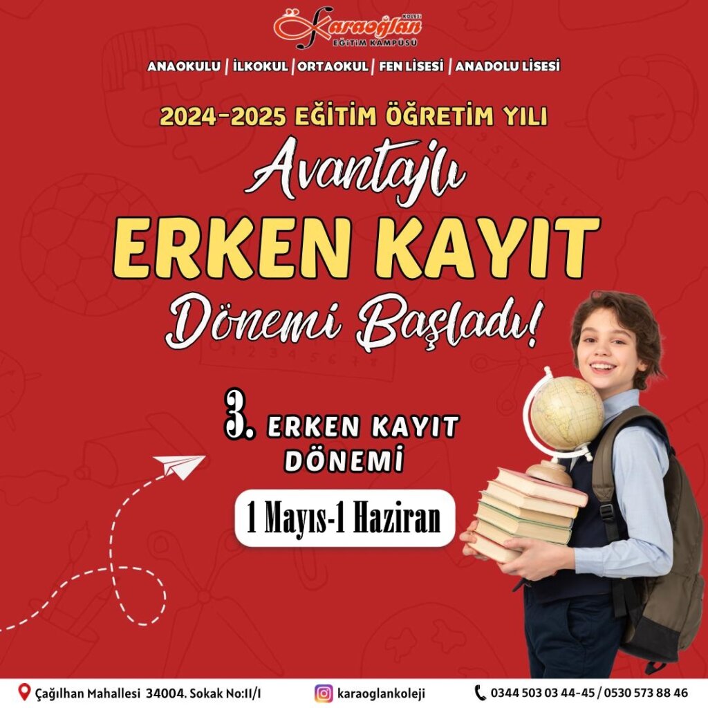 Bünyesinde Anaokulu,İlkokul,Ortaokul,Anadolu ve Fen Liselerini barındıran Karaoğlan Eğitim Kampüsü 2024-2025 Eğitim Öğretim yılı Avantajlı Erken kayıt döneminin 3’üncüsüne start verdi. 1 Mayıs-1 Haziran tarihlerinde geçerli olacak 3. Erken Kayıt Döneminde Avantajlar Velileri ve öğrencileri bekliyor.