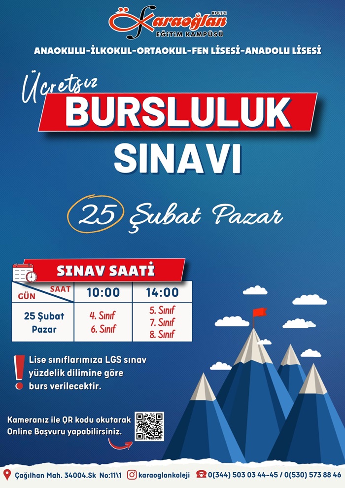 Bünyesinde Anaokulu,İlkokul,Ortaokul,Fen Lisesi ve Anadolu Lisesini barındıran Karaoğlan Koleji 25 Şubat tarihinde 2 seans halinde Ücretsiz Bursluluk sınavı düzenleyecek.
