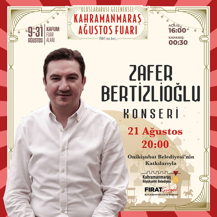 Uluslararası Geleneksel Ağustos Fuarı büyük bir heyecan ve ilgiyle devam ederken 21 Ağustos Çarşamba günü Türk Halk Müziği sanatçısı Zafer Bertizlioğlu, müzikseverlerle buluşacak. KAFUM’da düzenlenecek konser saat 20.00’da başlayacak.