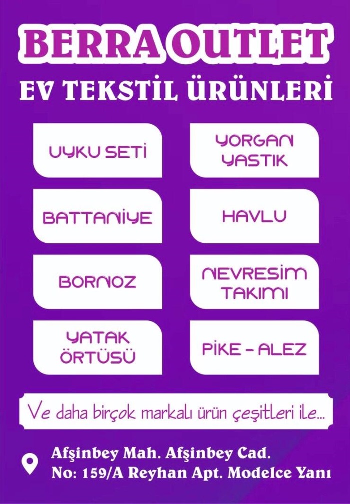 Afşin Haber’e konuşan Berra Outlet Ev Tekstil Ürünleri sahibi Emin Karaoğlan, Afşin’de ev tekstil ürünleri üzerine Outlet ürünleri ve seri sonu ürünlerinin satışını yapan ilk ve tek firmayız. Türkiye’de bildiğiniz ünlü markaların Outlet ürünlerini müşterilerimize sunuyoruz. Ürünlerimiz kaliteli ürünler ancak seri sonu ve ürünler olduğundan piyasa fiyatlarından daha uygun ve %70 indirimli fiyatlar. Müşterilerimizi bekliyoruz dedi.