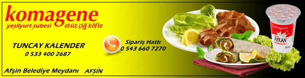 Yeşilyurt Mahallesi eski Belediye Binası yanında hizmet veren Komagene Çiğköfte Afşin Yeşilyurt Şubesi, Etsiz Çiğköfte de lider Komagene lezzetini Afşinlilere her gün tattırmanın mutluluğunu yaşıyor.