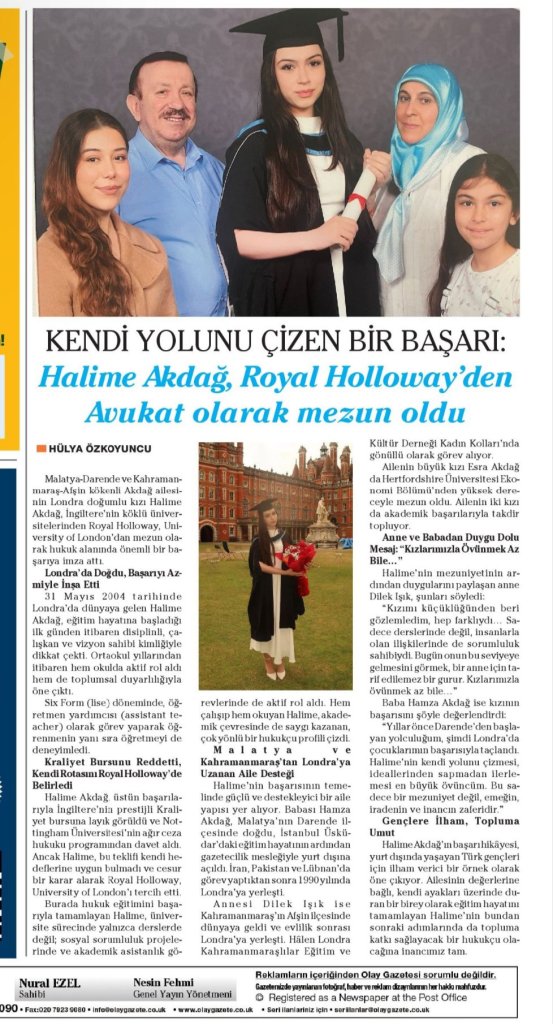 Hemşehrimiz Halime Akdağ’ın başarısı Londra Merkezli yayın yapan Olay gazetenin sürmanşetinden verildi.