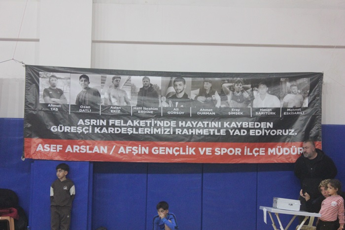 Afşin Kaymakamlığı koordinesinde, Afşin Belediye Başkanlığı katkıları ile Gençlik ve Spor İlçe Müdürlüğünce Şehit Numan Şeref Datlı Gençlik Merkezi Kapalı Spor Salonu’nda düzenlenen, 6 Şubat depremlerinde hayatını kaybeden güreşçi sporcular anısına Minikler ve Yıldızlar kategorisinde serbest stil olmak üzere, 110 sporcunun katılımıyla “Güreş Turnuvası” gerçekleştirildi.
