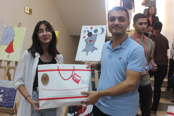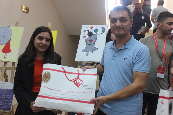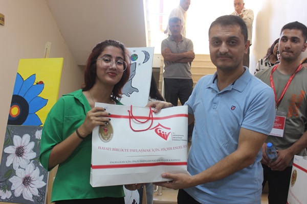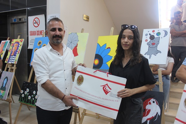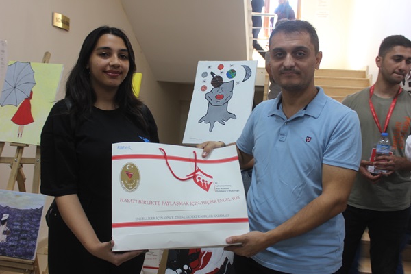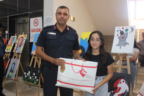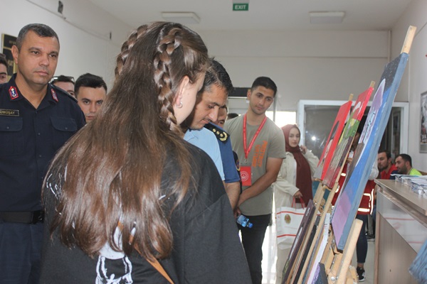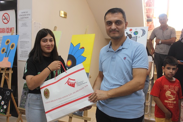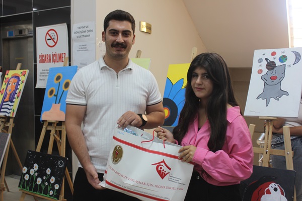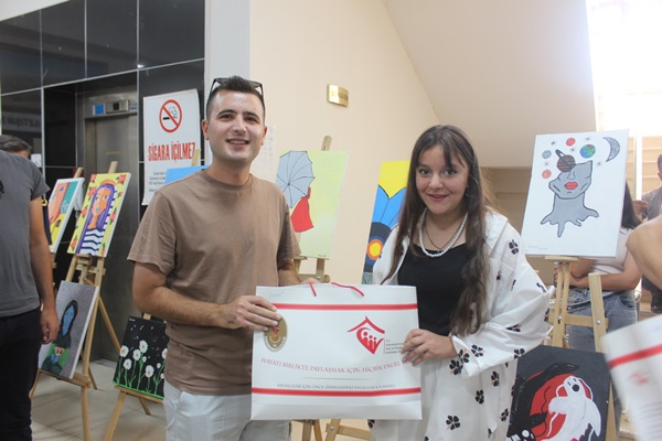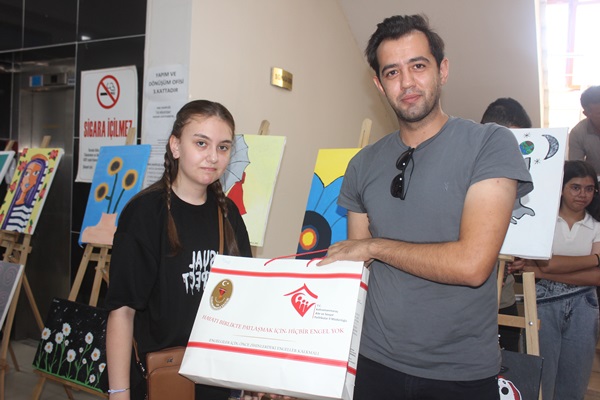 Açılış sonunda Resim sergisinde resimleri bulunan Depremzede gençlere hediyeler takdim edildi.40 Resim bulunan sergi 2 gün açık kalacak.