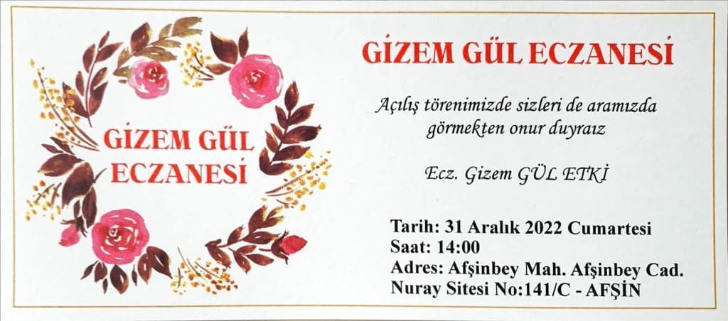 Afşin Haber aracılığı ile Afşinlilere davette bulunan Eczacı Gizem Gül Etki, “Afşin İlçemizde Atlaskent Işıklarda hizmet vermeye başlayan Gizem Gül Eczanemizin açılışı yapılacak. Tüm Afşinli vatandaşlarımızı açılış törenimizde aramızda görmekten mutluluk duyarız dedi.
