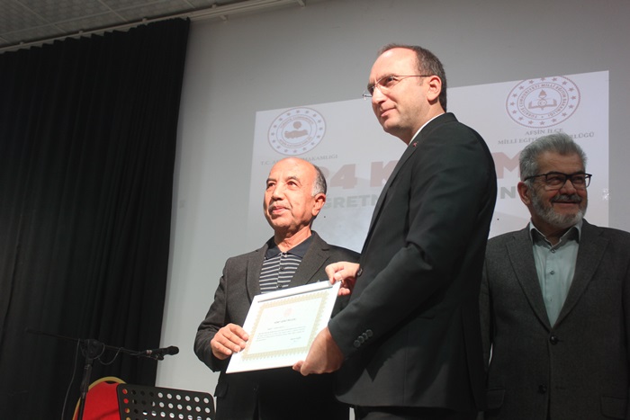 Saygı Duruşu ve İstiklal Marşının okunmasıyla başlayan programda açılış konuşmasını Afşin Merkez Fatih Ortaokulu Müdürü Yakup Karaoğlan yaptı. Karaoğlan, Bugün bir milleti ilimle,irfanla,ahlakla yoğuran Öğretmenlerimizin günü. Bu anlamlı gün yalnızca bir kutlama değil aynı zamanda vefa,minnet ve umutla geleceğe bakma günüdür dedi.