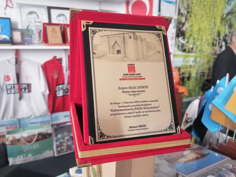 İstanbul’da faaliyet gösteren Afşin Eshab-ı Kehf Dostluk Kültür ve Çevre Derneği (AFŞİNDER) tarafından düzenlenen Kahramanmaraş Tanıtım Günlerine katkı ve katılım dolayısı ile Afşin Merkez Yayın Grubuna Teşekkür Plaketi takdim edildi.
