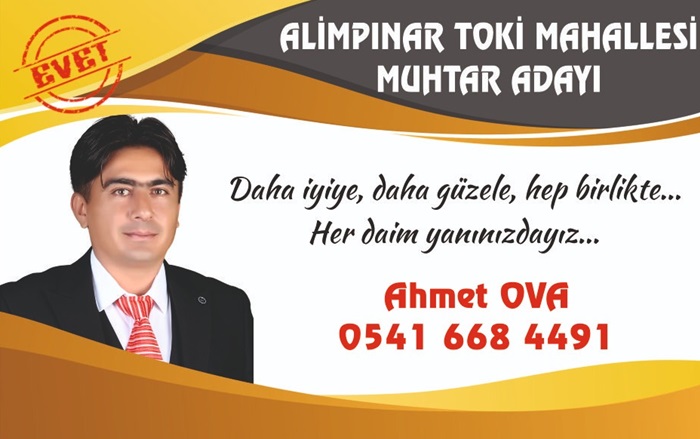 Hizmet için, halka hizmet hakka hizmet düsturu ile canla başla çalışmak için 31 Mart yerel Yönetimler seçimlerinde Muhtar Adaylığımı açıklıyorum diyen Alimpınar Mahallesi Muhtar Adayı Ahmet Ova, tüm mahalle sakinlerimden destek bekliyorum dedi.