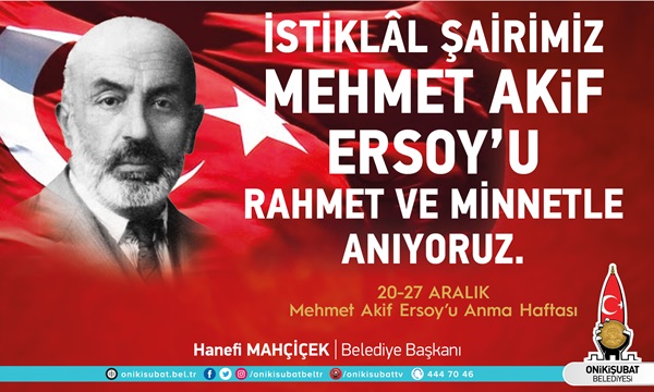 20-27 Aralık tarihleri arasında kutlanan Mehmet Akif Ersoy’u Anma Haftası dolayısıyla mesaj yayımlayan Onikişubat Belediye Başkanı Hanefi Mahçiçek, “Şiirini; imanı, düşüncesi ve milletinin hizmetine adayan, bağımsızlık mücadelemizin simgesi İstiklal Marşı’mızın yazarı milli şairimiz Mehmet Akif Ersoy’u vefatının 86’ncı yıl dönümünde rahmet ve minnetle yâd ediyorum” dedi.