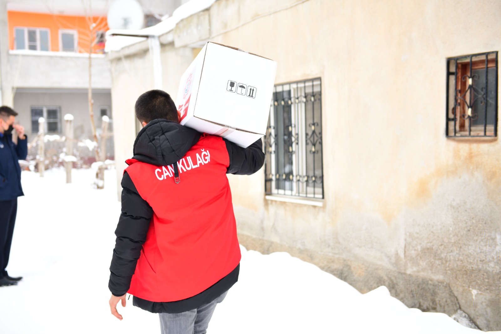 Ekipler tarafından belirlenen ihtiyaç sahibi vatandaşlara da Can Kulağı Platformu tarafından gıda kolisi dağıtılıyor.