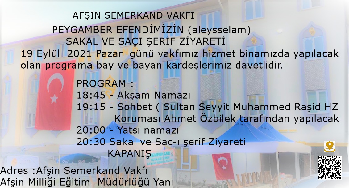 Semerkand Vakfı Afşin Temsilciliğince organize edilecek olan bir program çerçevesinde Peygamber Efendimiz Hz.Muhammed Mustafa (s.a.v)’in günümüze ulaşan Sakal-ı Şerifi ve Saçı Afşinlilerle buluşacak.