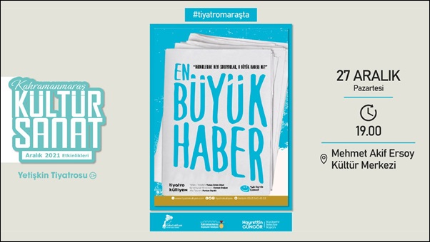 Büyükşehir Belediyesi Aralık Kültür Sanat Etkinlikleri kapsamında 27 Aralık Pazartesi (bugün) En Büyük Haber adlı yetişkin tiyatrosu izleyiciyle buluşacak.