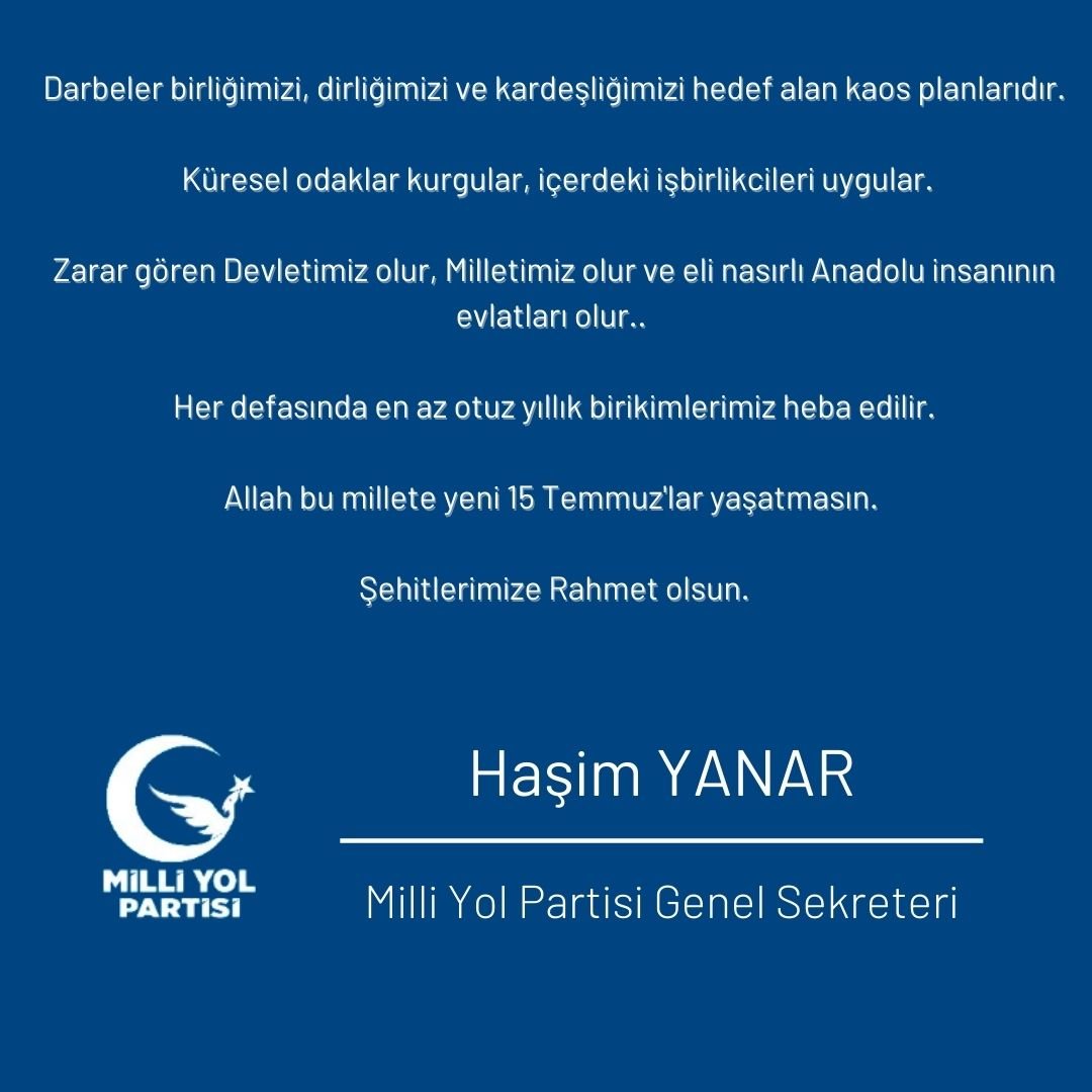 Milli Yol Partisi Genel Sekreteri Haşim Yanar, 15 Temmuz Demokrasi ve Milli Birlik Günü dolayısı ile bir mesaj yayınladı.