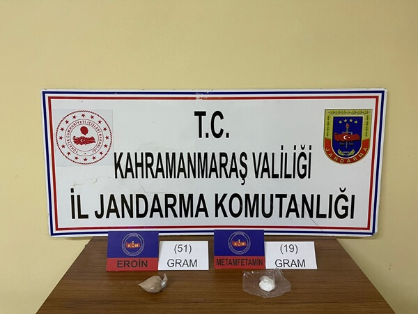 “Kahramanmaraş İl J. K. lığı ekiplerince 03.03.2022 günü saat: 17:30 sıralarında ÇimkoYol Kontrol Noktasında icra edilen faaliyet esnasında durdurulan bir araç içerisinde bulunan R. Ç (E-39) isimli şahsın üzerinde yapılan aramada; (51) gram Eroin ile (19) gram Metamfetamin maddesi ele geçirilmiştir. Olay ile ilgili adli tahkikata başlanılmış olup şüpheli şahıs gözaltına alınmıştır.Kahramanmaraş İl Jandarma Komutanlığınca halkın huzur ve güvenliğine yönelik çalışmalara azim ve kararlılıkla devam edilmektedir”