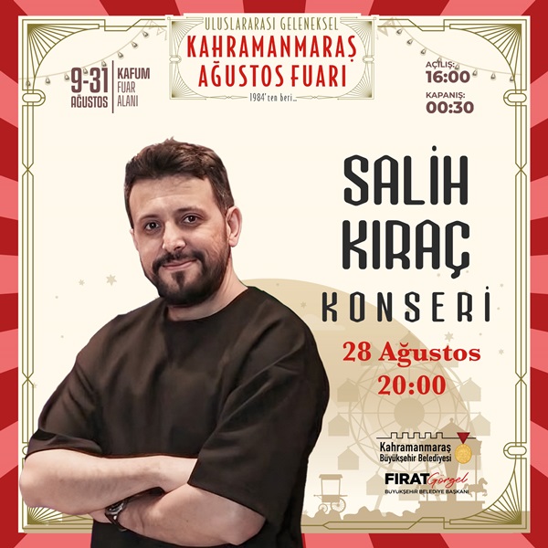 Büyük bir ilgi ve heyecanla süren Uluslararası Geleneksel Ağustos Fuarı’nda çocuk, genç ve yetişkinlere özel birbirinden güzel etkinlikler düzenlemeye devam ediyor. 28 Ağustos Çarşamba günü de fuarda sanat dolu bir gece yaşanacak. Etkinlik takvimi kapsamında, saat 20.00’da Türk Halk Müziği sanatçısı Salih Kıraç sahne alırken, saat 21.30’da ise Naim adlı sinema gösterisi gerçekleştirilecek. KAFUM Fuar Alanında düzenlenecek konserde Salih Kıraç, Türk Halk Müziği ziyafeti sunarken vatandaşlar, ülkemiz ve dünya spor tarihine damga vuran efsane halterci Naim Süleymanoğlu’nun hayat hikâyesini anlatan “Naim” filmi ile açık havada keyifli bir sinema deneyimi yaşayacak. Büyükşehir Belediyesinden yapılan açıklamada, konser ve açık hava sinemasına tüm vatandaşlar davet edilirken, 31 Ağustos’a kadar devam edecek Geleneksel Ağustos Fuarı’nda düzenlenecek tüm etkinliklere https://kahramanmaras.bel.tr/duyuru/2024/08/05/geleneksel-agustos-fuari-etkinlik-takvimi internet adresinden ulaşılabileceği belirtildi.