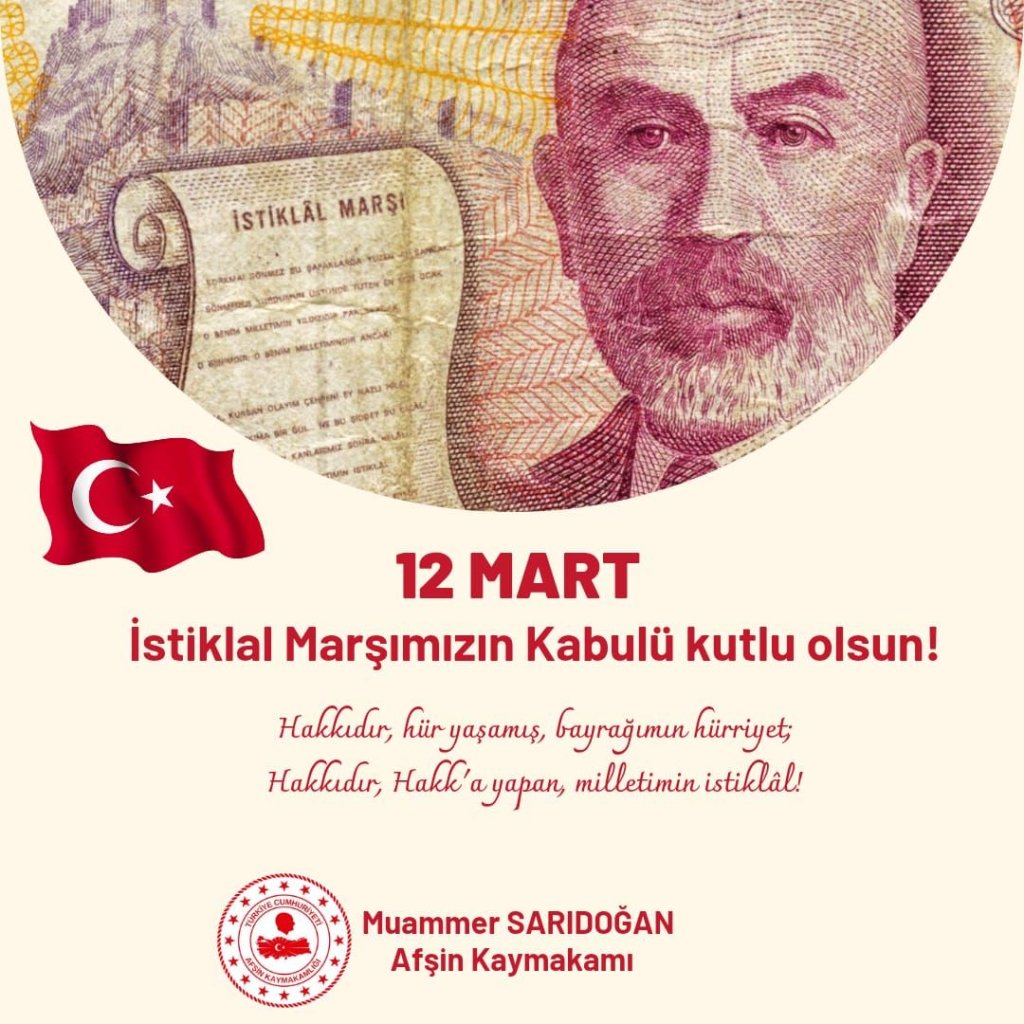 Afşin Kaymakamı Muammer SARIDOĞAN, 12 Mart İstiklal Marşımızın Kabulünün yıldönümü münasebetiyle bir mesaj yayınladı.