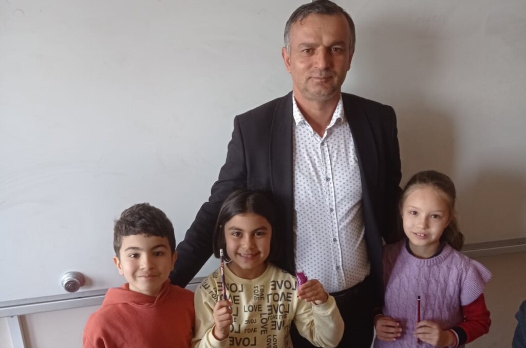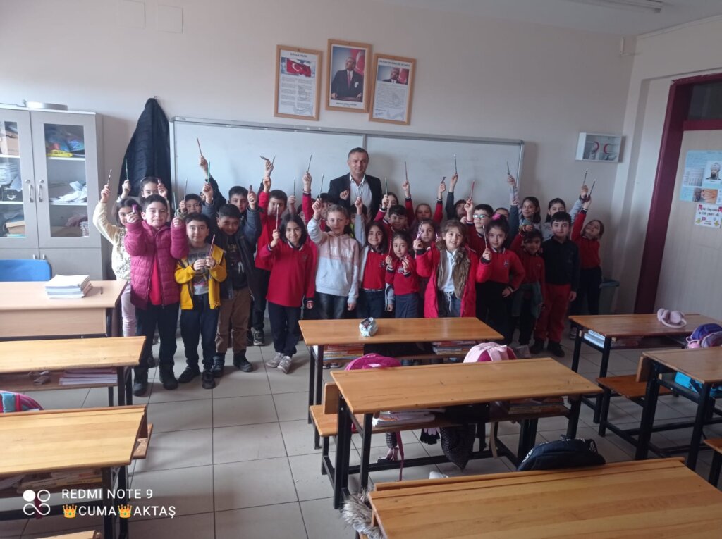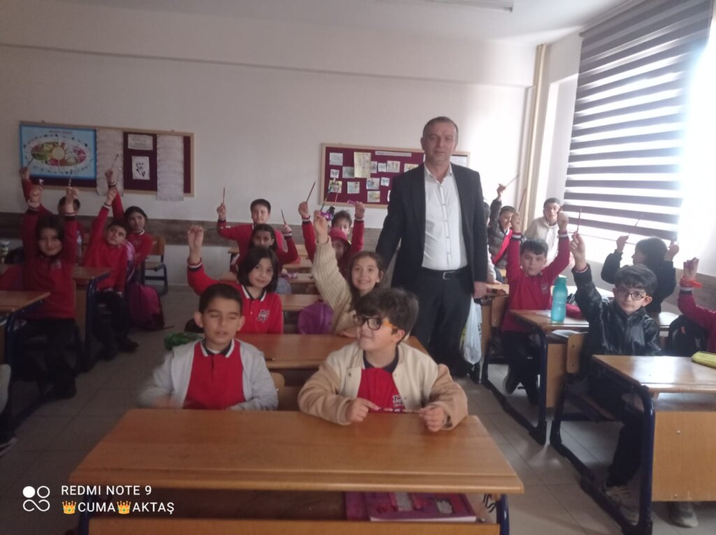 Ertuğrul Gazi ilkokulunu ziyaret eden Afşinbey Mahallesi Muhtar Adayı Cuma Aktaş, öğrencilere 150 adet kalem ile çikolata dağıttı.