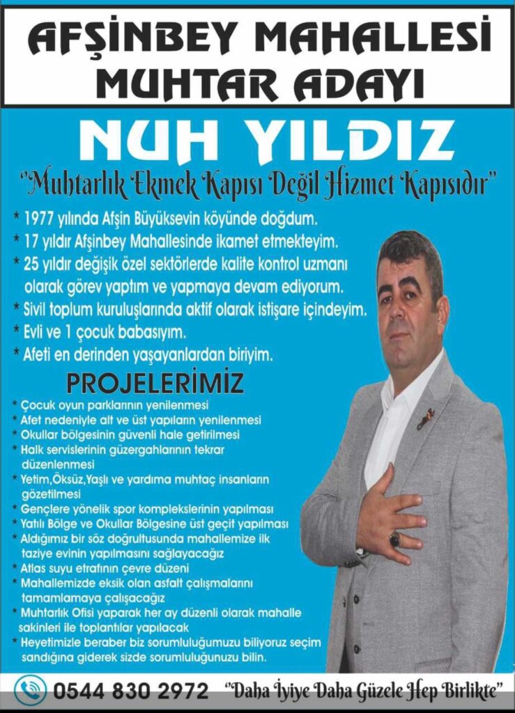 Yatılı bölge ve okullar bölgesine üst geçit yapılması, aldığımız bir söz doğrultusunda mahallemize ilk taziye evinin yapılması, Atlas suyu etrafının çevre düzeni, mahallemizde eksik olan asfalt çalışmalarının tamamlanması da yapmak istediklerimiz arasında diyen Afşinbey Mahallesi Muhtar Adayı Nuh Yıldız,muhtarlık Ofisi yaparak her ay düzenli olarak mahalle sakinleri ile toplantılar yapılmasını sağlayacağız. Heyetimizle beraber biz sorumluluğumuzu biliyoruz seçim sandığına giderek Siz de sorumluluğunuzu yerine getirin dedi.