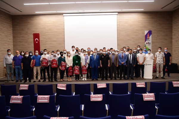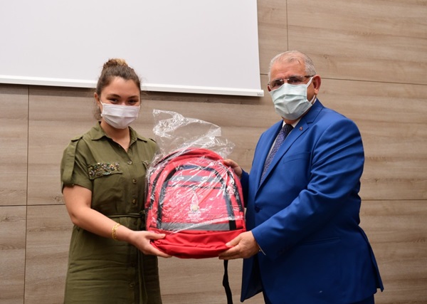 İlimiz afeti yüksek risk bölgesi konumunda bulunuyor. Bilinçli farkındalık ile bu projeyi yürütüyoruz. Sizlere bugün bireysel olarak kullanacağınız acil durum çantası hediye edeceğiz. Hepinize teşekkür ediyor, afetsiz günler diliyorum.”